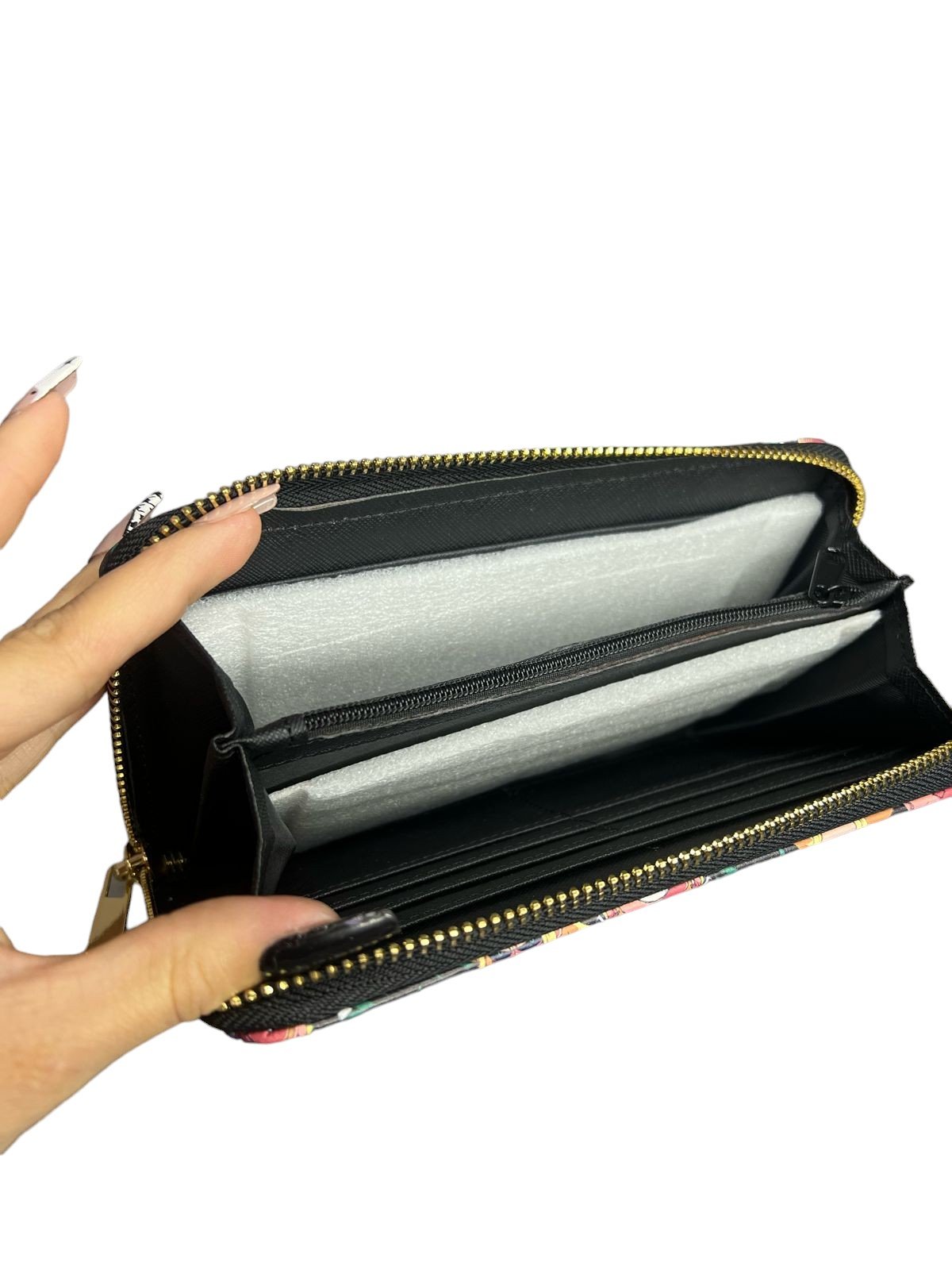 Con unas medidas de 20cm de ancho por 10cm de alto, esta billetera es lo suficientemente compacta para caber en cualquier bolso o bolsillo, ofreciendo al mismo tiempo suficiente espacio para tus tarjetas y efectivo.